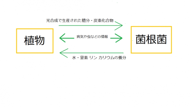 ・逆に菌根菌は、植物が光合成によって生産された糖分・炭水化合物をもらい、お互いが必要な養分をやり取りして共生しています。