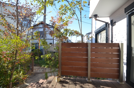 ココマのテラスタイプと腰壁タイプを、その周りを目隠しとして、プラスGシリーズのGスクリーンでコの字型に囲みました。