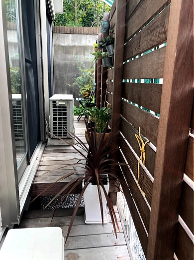 ・掃き出し窓側は、イタウバ材でフェンス+デッキを施工。