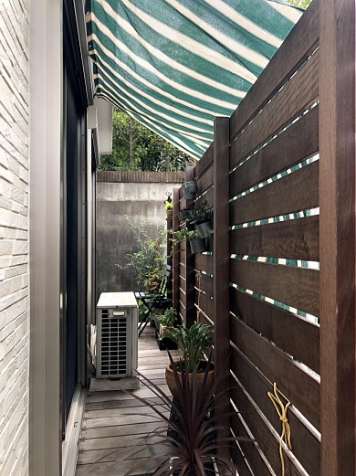 限られたスペースを有効活用できるウッドデッキ、素敵に鉢植えを飾られて、シェードをして快適空間にされてました。
