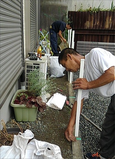 お隣さんにお願いをしてメッシュフェンスを一旦外させてもらい工事をしました。