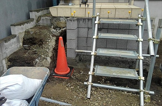 玄関ポーチ階段の一番上の段は残し、あとの段と両脇の花壇は撤去、型枠化粧ブロック積みで土留め施工、階段の位置を変更し新たに階段造作します。