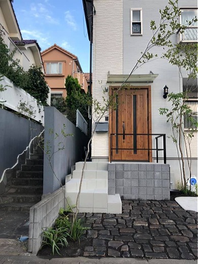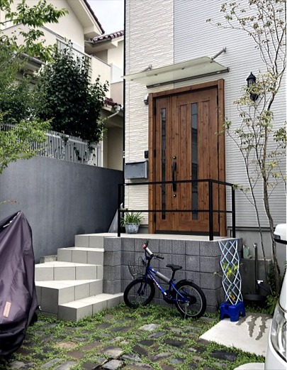・ポーチ階段の位置を換え、玄関ドアを新しい物に交換し開閉を逆に、出入りしやすいように。