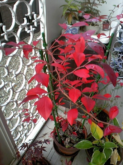 ブル-ベリ-は、春には壷型の花を付け、夏に紫色の実になり、秋には葉っぱが真っ赤に紅葉します。冬になると落葉低木なので、葉っぱが全部落ちても、枝ぶりが楽しめます。