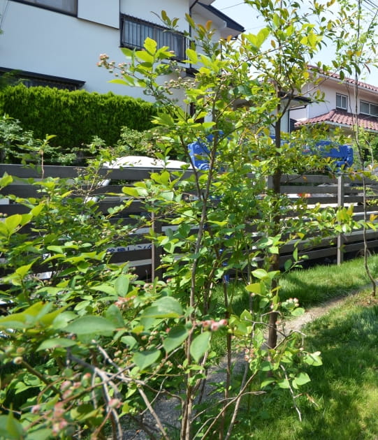 写真がちょっとボケていますが・・・手前の低木がブルーベリーです。