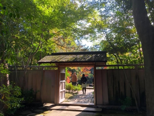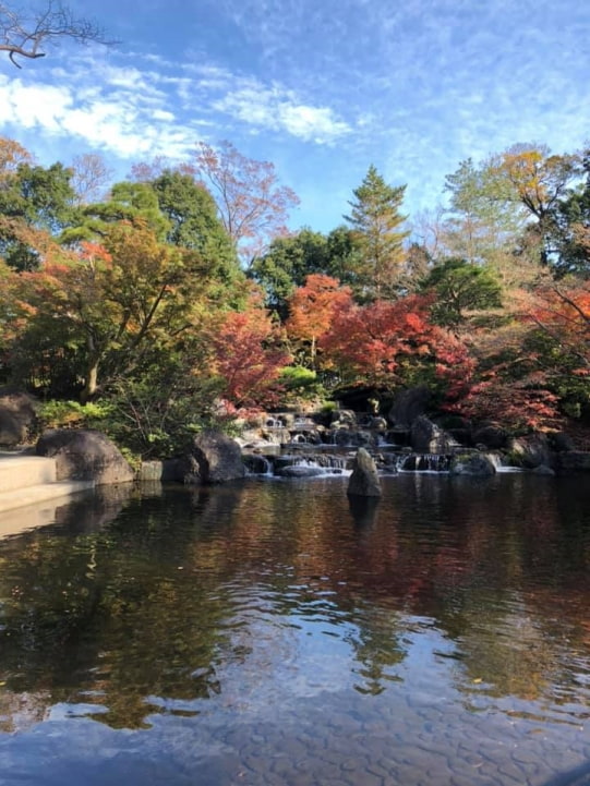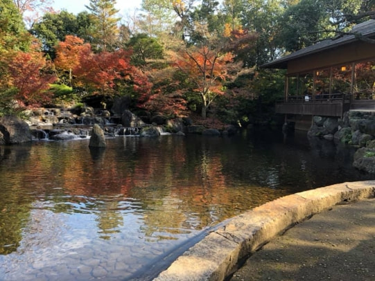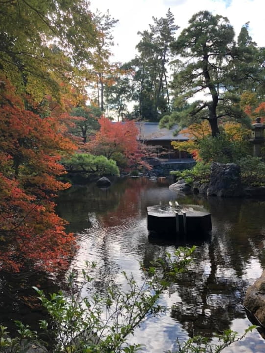 内門を抜けて正面からの景色です。こちらの庭のように、大きな池を中心に園内を回遊して鑑賞する庭を池泉回遊式庭園と言います。