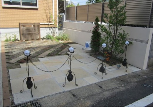 それに対して「駐車場兼庭」は、自然石や枕木敷きで、自然素材を使ったり、コンクリート箱抜きで石畳風にデザインしたり、また古窯レンガ敷きなどで、車が乗っても大丈夫な仕様に。