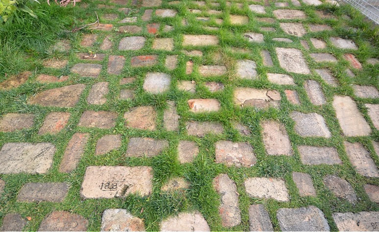これは、古窯レンガと西洋芝の草目地駐車場です。西洋芝は、種撒きして育てます。草目地施工はお施主様セルフでやってもらうことも多く、こちらの草目地もそうです。