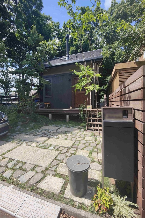 庭の一部が、臨時駐車場になるよう、タイヤが乗る箇所を枕木敷きにしています。