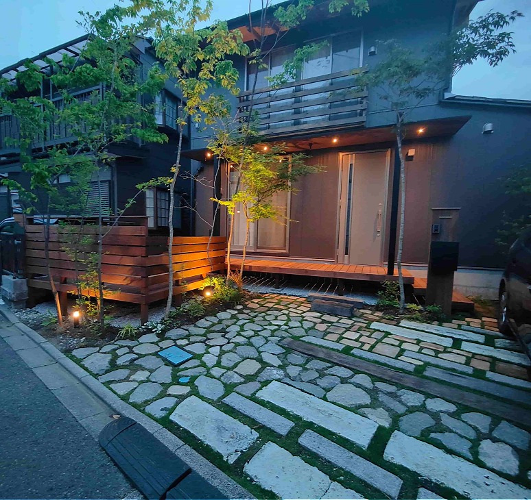 街灯が近くにない場合は、ライティングすることをおすすめいたします。実感として、疲れて家に帰ってきて、家に灯りが付いているとホッとします。我が家は、タカショーもローボルトライトを採用しており、明暗センサーでオンオフしています。