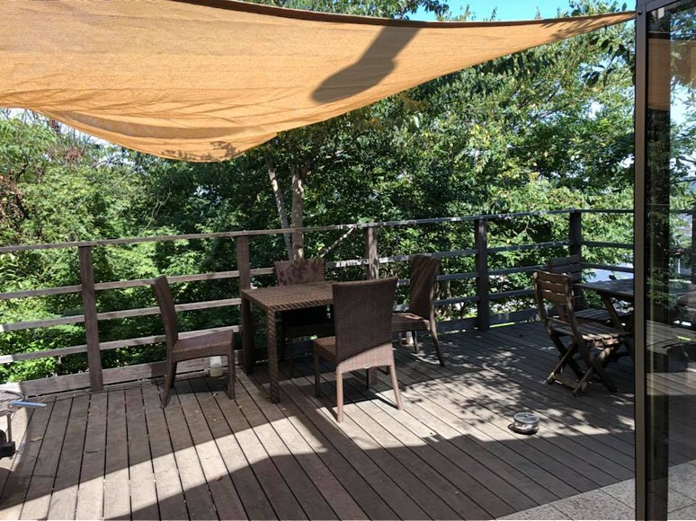 サフランのモリニワデッキも以前はシェードを、木にくくりつけて設置していました。タカショーで特注購入した、かなりのサイズのシェードでした。雨は通すメッシュ素材だったため、夏の間中、取り外すこともなく、結構な雨風の日でも平気でした。ただ一度外れたのが、避難勧告が出た2019年の台風の時です。