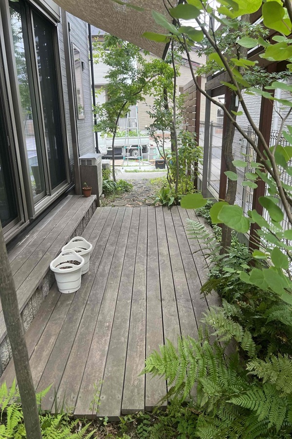 この写真の場合は、建物2階窓に柵がありまして、柱と柵でシェードを張っています。シェードはネットで購入した安価なもので、三角形を2枚、ウッドデッキのサイズの合わせて選んで設置しています。