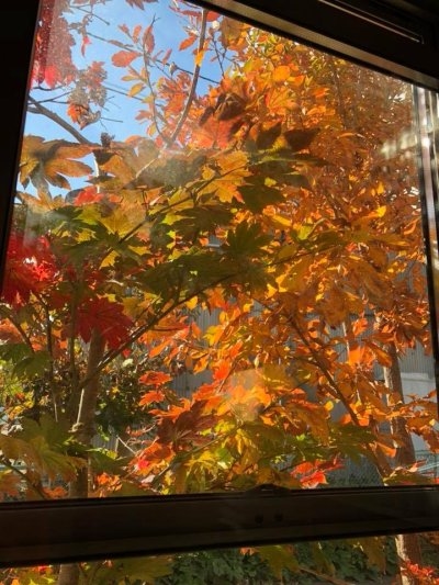 樹種によって紅葉する色は違い、黄色、赤、オレンジ・・・と色様々に色づく紅葉は、落葉樹を楽しむひとつです。緑色から徐々に色づく過程のグラデーションの様も見ものです。写真は、店長が座っている席の横の窓から見えるハウチワカエデとコナラです。