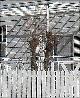 剪定後 ぶつ切りされた切り口から細い枝が不自然に出てるのが見えます。これを自然な枝ぶりに、まだまだ年月が掛かりそうです。
