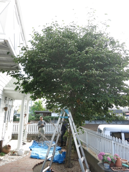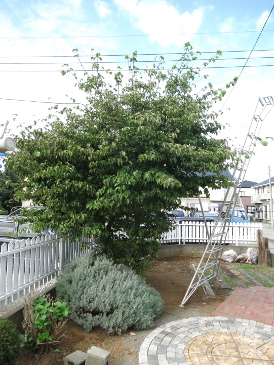 いよいよ最初の剪定です。ハーフビルドのお庭改造計画のS様邸。アプローチとテラス工事が先行だったので、初めてヤマボウシを見てから2年半以上経ってからの剪定になりました。