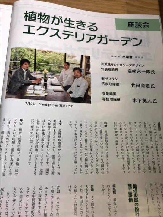 座談会のお相手は、公園なども手掛けるガーデンデザイナーで、講師としてお話をお聞きすることが多い、宮城県仙台市の(有)東北ランドスケープデザインの岩崎さん。もう一方は、園芸店も経営していることもあり、園芸業界や流通について精通し、造園やエクステリアも手掛けていらっしゃいます、長野県飯田市の(有)黄鶴園の木下さんです。