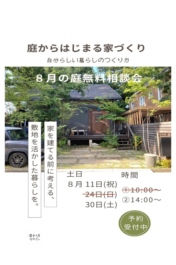 ホーム お庭無料相談会 過去のお庭無料相談会 新築外構・庭工事をご検討の方へ 8月の庭無料相談会 新築外構・庭工事をご検討の方へ 8月の庭無料相談会 2025年7月20日現在の予約状況です。ご希望の方はお早目に
