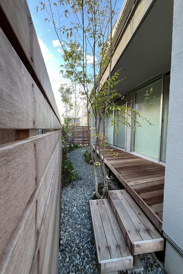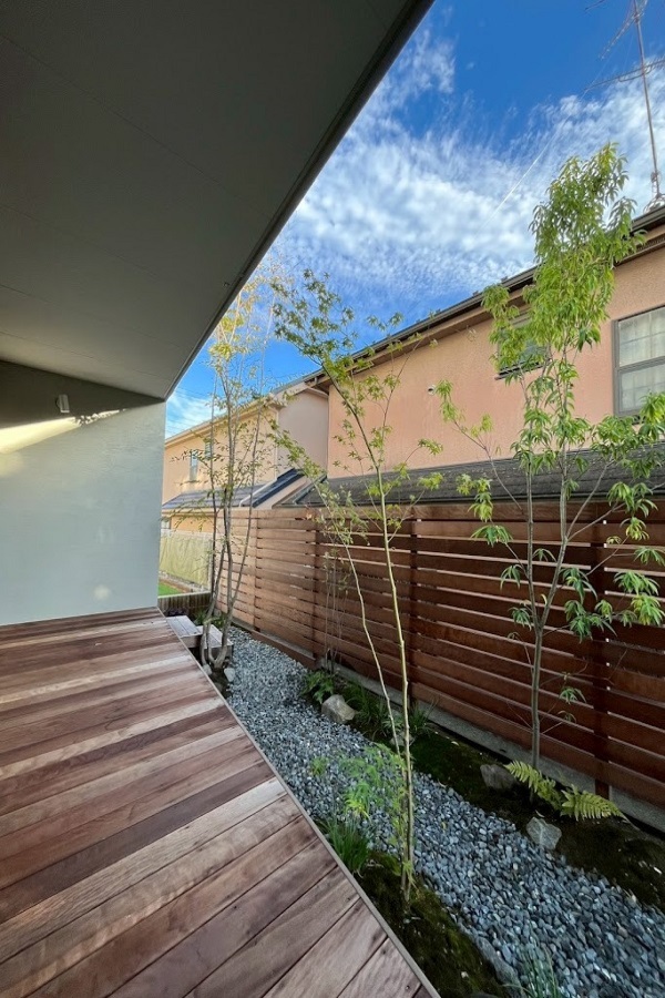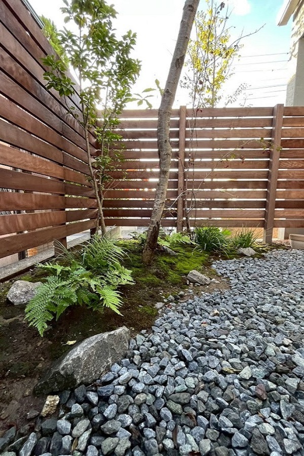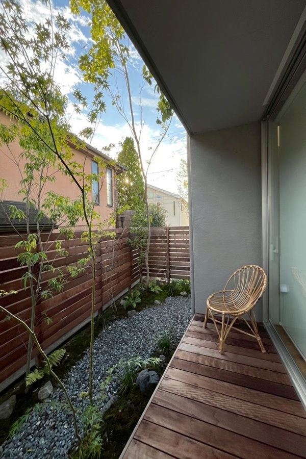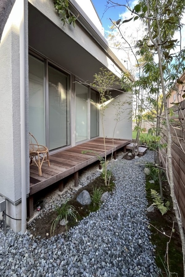 ホーム フォトギャラリー 新築・リフォーム すべて 神奈川県横浜市 緑豊かな庭を眺めながら暮らす毎日にモリニワをつくりました。 K様邸 神奈川県横浜市 緑豊かな庭を眺めながら暮らす毎日にモリニワをつくりました。 K様邸 新築 新築・リフォーム|すべて ご新築のK様邸。緑のある庭をご希望、弊社のモリニワにご共感いただき、庭の設計・施工をご依頼くださいました。自然素材を使って、山採り雑木を植え、見た目の心地良さはもちろん、四季を通して自宅で過ごしやすい環境づくりをしました。画像のみを表示全 7 枚中 1 枚目を表示Next ≫ 広縁のように、軒下部分を全面ウッドデッキを施工。デッキの高さは、掃き出し窓サッシ下からフラットな高さに設定。箱型ステップも設置。画像のみを表示全 7 枚中 2 枚目を表示≪ Prev|Next ≫ 築山のようにし、地苔を撒いています。そのまわりの園路は砂利敷きに。画像のみを表示全 7 枚中 3 枚目を表示≪ Prev|Next ≫ 山採り雑木は落葉樹が中心に、庭に木陰・木漏れ日が出来ることを目的とした「モリニワ」になるように植えています。3年後が完成形で、夏は涼しく、冬暖かな庭になります。画像のみを表示全 7 枚中 4 枚目を表示≪ Prev|Next ≫ 境界フェンスはハードウッド材で。ハードウッドの特徴でアクが落ちて、1年くらいでシルバーグレー色になります。気になるお隣の窓箇所には、目隠しに常緑樹であるシラカシを植えています。画像のみを表示全 7 枚中 5 枚目を表示≪ Prev|Next ≫ 施工前の室内から見た様子です。毎日、どんな景色を眺めながら生活したいか・・・は大事に思えますね。フェンスの目隠し度合いがどれくらいほしいのか?板張りの隙間ピッチは?施工前現地確認時に、図面上ではわからなかった、実際の感じを見ていただだき、ご相談して設定し施工いたします。画像のみを表示全 7 枚中 6 枚目を表示≪ Prev|Next ≫ 駐車場側は、法面仕上げにしています。高木を植えて、ロックガーデン風に石を据えて、お引き渡し。あとはご自身で施工されています。広縁のように、軒下部分を全面ウッドデッキを施工。デッキの高さは、掃き出し窓サッシ下からフラットな高さに設定。箱型ステップも設置。画像のみを表示全 7 枚中 7 枚目を表示≪ Prev 一覧へ戻る 新築・リフォーム 地域別 スタイル別 シーン別 ご来店お客様用資料 すべて 新築 リフォーム 厚木市 相模原市 伊勢原市 海老名市 座間市 綾瀬市 綾瀬市 大和市 愛川町・清川村 藤沢市 藤沢市 茅ヶ崎市 鎌倉市 横浜市 逗子市 葉山町 川崎市 二宮町 大磯町 小田原市 平塚市 秦野市 南足柄市 寒川町 開成町 東京都町田市 東京都八王子市 東京都多摩市 東京都日野市 東京都三鷹市 東京都府中市 東京都世田谷区・杉並区 東京都稲城市 和風 アウトドア 和モダン 駐車場兼庭 ウッドデッキ モリニワ 門周り・玄関周り 目隠し・間仕切り テラス アプローチ 店舗 植栽 施工