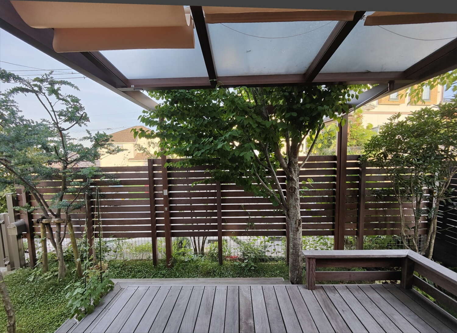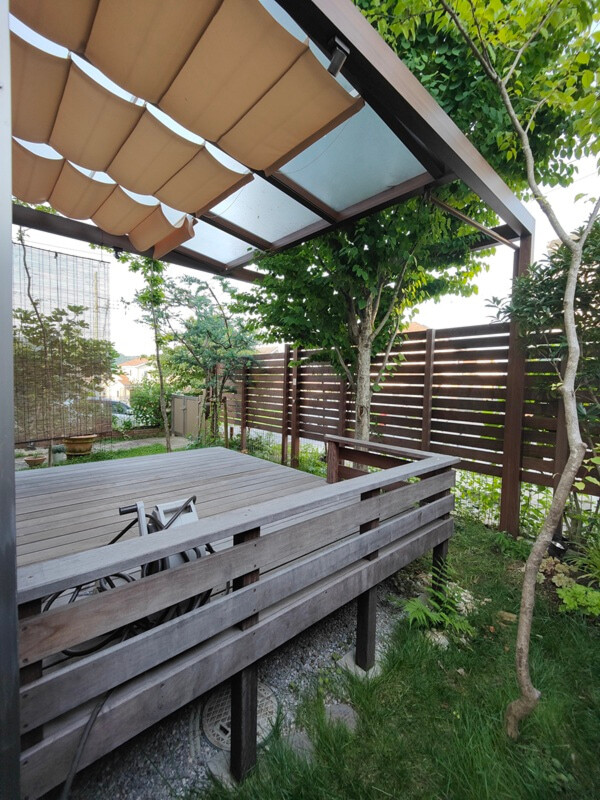 ホーム フォトギャラリー 新築・リフォーム リフォーム 神奈川県愛甲郡愛川町 ウッドデッキで段差解消 ワンちゃんと一緒に過ごせる快適ガーデンにリフォーム M様邸 神奈川県愛甲郡愛川町 ウッドデッキで段差解消 ワンちゃんと一緒に過ごせる快適ガーデンにリフォーム M様邸 リフォーム 新築・リフォーム|リフォーム 築8年経つ芝生の庭のガーデンリフォームです。 室内からフラットにつながるウッドデッキは、3段のステップデッキにして、ベンチ替わりに腰掛けることも。画像のみを表示全 9 枚中 1 枚目を表示Next ≫ BEFORE 掃き出し窓から庭に出るには段差があります。急に出てかないか、ワンちゃんたちもちょっと注意して見ててないと危ないです。画像のみを表示全 9 枚中 2 枚目を表示≪ Prev|Next ≫ AFTER 蹴上げの高さは、ワンちゃんの歩幅を考えて設定しています。 シェードを付けたGルーフ(LIXIL)で屋根を掛けて、快適に過ごせます。画像のみを表示全 9 枚中 3 枚目を表示≪ Prev|Next ≫ 室内からフラットにつながるウッドデッキは間口3000mm×出幅2400mmの広さ。低いデッキフェンスを設置し、ひじ掛けにしり、飲み物を置いてちょっとしたテーブル代わりにもなります。ワンちゃんの飛び出し防止にも。画像のみを表示全 9 枚中 4 枚目を表示≪ Prev|Next ≫ ステップがない箇所はワンちゃんが落ちないように、ウッドフェンスを設置。 笠木はカップを置いたり、ちょっとしたテーブル代わりにもなります。画像のみを表示全 9 枚中 5 枚目を表示≪ Prev|Next ≫ 建物側から見たウッドデッキ。 奥に見えるウッドフェンスも弊社施工ですが、道路からの目隠しがあると、心置きなく庭で過ごせます。画像のみを表示全 9 枚中 6 枚目を表示≪ Prev|Next ≫ ちなみに、ワンちゃん用フェンスも設置しました。画像のみを表示全 9 枚中 7 枚目を表示≪ Prev|Next ≫ BEFORE 既存のブロックとメッシュフェンスを撤去して、新たに天然素材ウッドフェンスを施工しています。撤去したメッシュフェンスは、ワンちゃんガードのメッシュフェンスとして再利用してます。画像のみを表示全 9 枚中 8 枚目を表示≪ Prev|Next ≫ AFTER 道路から丸見えだった庭をハードウッド材のフェンスで囲い目隠し。目隠しが不必要な下の方は、板を減らして抜け感を持たせて、またコストダウンにもなります。ワンちゃんが出ていってしまう可能性があるので、メッシュフェンスでガードしています。画像のみを表示全 9 枚中 9 枚目を表示≪ Prev 一覧へ戻る 新築・リフォーム 地域別 スタイル別 シーン別 ご来店お客様用資料 すべて 新築 リフォーム 厚木市 相模原市 伊勢原市 海老名市 座間市 綾瀬市 大和市 愛川町・清川村 藤沢市 茅ヶ崎市 鎌倉市 横浜市 逗子市 葉山町 川崎市 二宮町 大磯町 小田原市 平塚市 秦野市 南足柄市 寒川町 開成町 東京都町田市 東京都八王子市 東京都多摩市 東京都日野市 東京都三鷹市 東京都府中市 東京都世田谷区・杉並区 東京都稲城市 和風 アウトドア 和モダン 駐車場兼庭 駐車場 ウッドデッキ モリニワ・雑木の庭 テラス 門周り・玄関周り 目隠し・間仕切り アプローチ 店舗 カーポート・自転車置き場(サイクルポート) ガーデンアイテム 植栽 施工