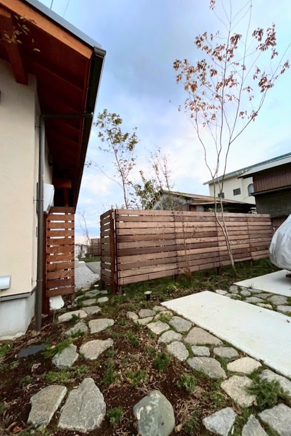 ホーム フォトギャラリー 新築・リフォーム すべて 神奈川県伊勢原市 新築外構 パッシブハウスの家は自然素材を使って M様邸 神奈川県伊勢原市 新築外構 パッシブハウスの家は自然素材を使って M様邸 新築 新築・リフォーム|すべて 自然素材を使って、パッシブデザインの家を手掛ける、神奈川エコハウスさんでご新築されたM様邸。建物と雰囲気が合っていると外構・庭工事を弊社ご依頼くださいました。画像のみを表示全 7 枚中 1 枚目を表示Next ≫ アプローチは自然石敷き+草目地。画像のみを表示全 7 枚中 2 枚目を表示≪ Prev|Next ≫ お隣との境界フェンスは、ハードウッド材で。枕木門柱とポストはフィール(オンリーワンクラブ)画像のみを表示全 7 枚中 3 枚目を表示≪ Prev|Next ≫ 駐車場は、箱抜きコンクリートを車のタイヤが乗る箇所と、自然石敷きに草目地の組み合わせに。画像のみを表示全 7 枚中 4 枚目を表示≪ Prev|Next ≫ 画像のみを表示全 7 枚中 5 枚目を表示≪ Prev|Next ≫ Rのラインがやさしい印象の洗い出しコンクリートテラス。素材は無機質なコンクリートですが、洗い出し仕上げにすることで、庭に馴染みます。庭の外周の境界フェンスはハードウッド材で施工。画像のみを表示全 7 枚中 6 枚目を表示≪ Prev|Next ≫ テラスに木陰・木漏れ日が出来るように、コナラ・ソロなどを植えて、モリニワに。完工時は、ちょっとさみしい景色ですが、四季の変化を楽しみながら、3年後が完成形になる予定です。下草類、グランドカバー、レンガで飛び石などは、ご自身でガーデニングされています。画像のみを表示全 7 枚中 7 枚目を表示≪ Prev 一覧へ戻る 新築・リフォーム 地域別 スタイル別 シーン別 ご来店お客様用資料 すべて 新築 リフォーム 厚木市 相模原市 伊勢原市 海老名市 座間市 綾瀬市 綾瀬市 大和市 愛川町・清川村 藤沢市 藤沢市 茅ヶ崎市 鎌倉市 横浜市 逗子市 葉山町 川崎市 二宮町 大磯町 小田原市 平塚市 秦野市 南足柄市 寒川町 開成町 東京都町田市 東京都八王子市 東京都多摩市 東京都日野市 東京都三鷹市 東京都府中市 東京都世田谷区・杉並区 東京都稲城市 和風 アウトドア 和モダン 駐車場兼庭 ウッドデッキ モリニワ 門周り・玄関周り 目隠し・間仕切り テラス アプローチ 店舗 植栽 施工