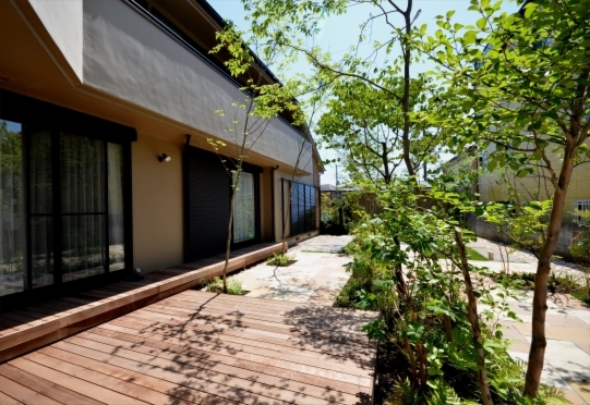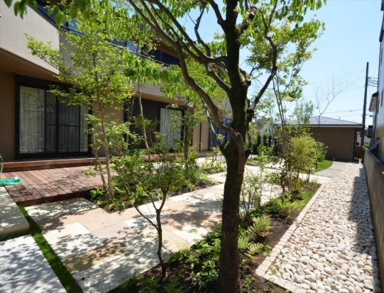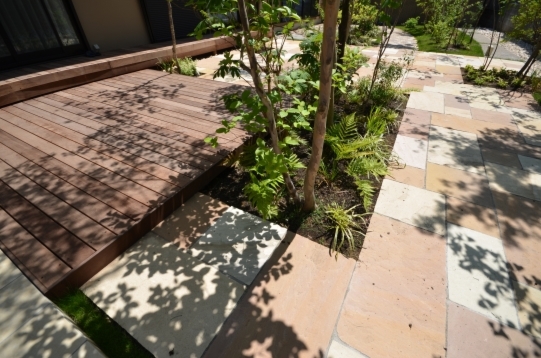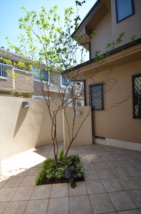 ホーム フォトギャラリー 新築・リフォーム すべて 神奈川県厚木市 芝生のお手入れ大変!なら雑木のあるテラスガーデンリフォームは? K様邸 神奈川県厚木市 芝生のお手入れ大変!なら雑木のあるテラスガーデンリフォームは? K様邸 リフォーム 新築・リフォーム|すべて 神奈川県厚木市K様邸のガーデンリフォームが完成しました。アンティーク石畳のような風合いのクラシカル・タンブル フォレストとブランカ ミックス貼りの園路。コナラ、ソロの雑木が出迎えてくれます。施工前は・・・画像のみを表示全 10 枚中 1 枚目を表示Next ≫ Before周りに常緑樹を中心に樹木が植えられ、芝生が広がる庭でした。このままで十分素敵なお庭ですが、芝生のお手入れが大変になってきたためリフォームのご依頼をいただきました。お手入れが必要な土の部分の面積を減らしながら、それでも避暑地のような森の緑を楽しむお庭にリフォームしました。画像のみを表示全 10 枚中 2 枚目を表示≪ Prev|Next ≫ Before物干し用ココマの前も芝生。ちらりと見えてますが、既存樹木には、コニファー類や常緑樹が多く植えられていました。画像のみを表示全 10 枚中 3 枚目を表示≪ Prev|Next ≫ Afterココマの床のタイルテラスに合わせて延長してタイルテラスを施工。錆びのピンコロ石で囲い家庭菜園スペースも設ける。目隠ししたい場所には、ホンサカキやハイノキ、カラタマオガタマ、ハマヒサカキの常緑樹を植え、タイルテラス中央に、コナラ、ヤマコウバシを、ココマ側にはソロ、ジューンベリーの落葉樹を植えました。画像のみを表示全 10 枚中 4 枚目を表示≪ Prev|Next ≫ 隣地寄りに植えられてた樹木は移植と撤去するものにと整理。手前の木は残して自然風剪定をしたハナミズキ。樹木が成長して枝葉がお隣にはみ出ることを気に掛けなくて良いように、植栽スペースを移動、境界寄りは伊勢ゴロタ石敷きに。画像のみを表示全 10 枚中 5 枚目を表示≪ Prev|Next ≫ 掃き出し窓前のコンクリートテラスだったものを活かして、イタウバ材デッキを施工。ステップデッキにすることで、室内から庭への出入りもしやすく、ベンチがわりに座ることもできます。画像のみを表示全 10 枚中 6 枚目を表示≪ Prev|Next ≫ ウッドデッキの先には自然石方形石敷きのテラス。夏の日射による高温対策として、木陰を落とすよう高木を植えてます。ちなみに、高木を植えると、成長して木陰が大きくなるほど雑草も生えにくくなり、お手入れの軽減にもなります。画像のみを表示全 10 枚中 7 枚目を表示≪ Prev|Next ≫ 自然石方形石は、サンドストーン(メイクランド)ミックスゴールドとミックスイエローを採用。大きさもランダムに混ぜて貼っています。画像のみを表示全 10 枚中 8 枚目を表示≪ Prev|Next ≫ 和室前の自然石敷きのテラスは、デュオストーン アルディ(メイクランド) 300角と600×300と乱形貼りに。伊勢ゴロタ石を敷いて雨落ちに。画像のみを表示全 10 枚中 9 枚目を表示≪ Prev|Next ≫ 植物が枯れて鉢だけ置いてあったテラスに植栽をというご希望で、ナツハゼの株立ちとキチジョウソウ、ヒューケラなどを植え、彩りを加えました。広いお庭の場所毎のイメージと目的に沿った機能を考慮したガーデンリフォームです。お忙しいご家族の癒しの空間になるとうれしいです。画像のみを表示全 10 枚中 10 枚目を表示≪ Prev 一覧へ戻る 新築・リフォーム 地域別 スタイル別 シーン別 ご来店お客様用資料 すべて 新築 リフォーム 厚木市 相模原市 伊勢原市 海老名市 座間市 綾瀬市 綾瀬市 大和市 愛川町・清川村 藤沢市 藤沢市 茅ヶ崎市 鎌倉市 横浜市 逗子市 葉山町 川崎市 二宮町 大磯町 小田原市 平塚市 秦野市 南足柄市 寒川町 開成町 東京都町田市 東京都八王子市 東京都多摩市 東京都日野市 東京都三鷹市 東京都府中市 東京都世田谷区・杉並区 東京都稲城市 和風 アウトドア 和モダン 駐車場兼庭 ウッドデッキ モリニワ 門周り・玄関周り 目隠し・間仕切り テラス アプローチ 店舗 植栽 施工