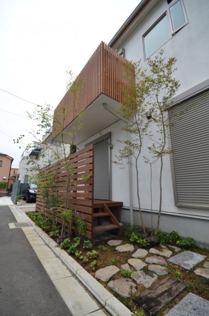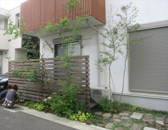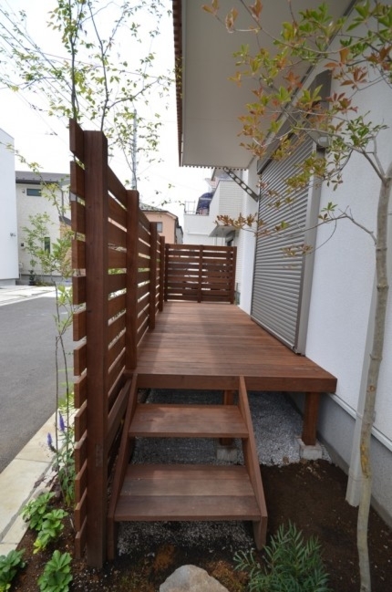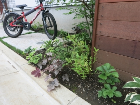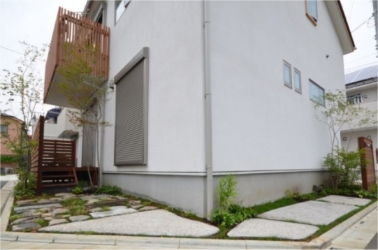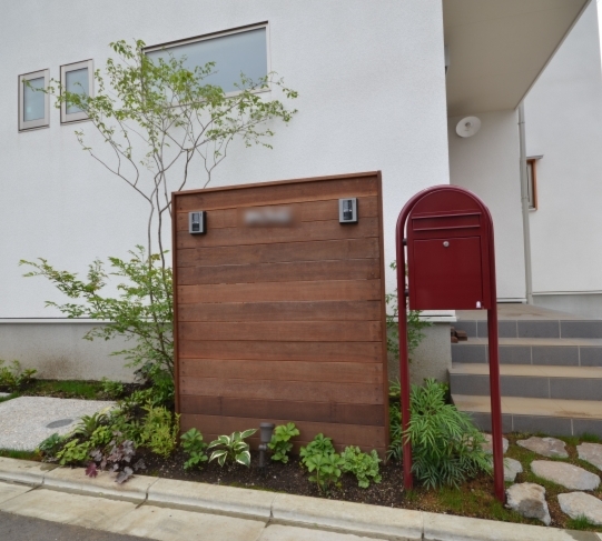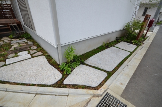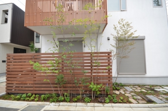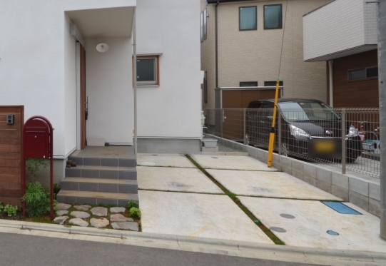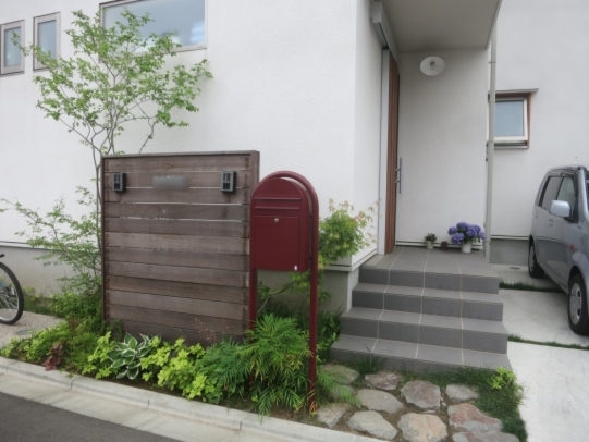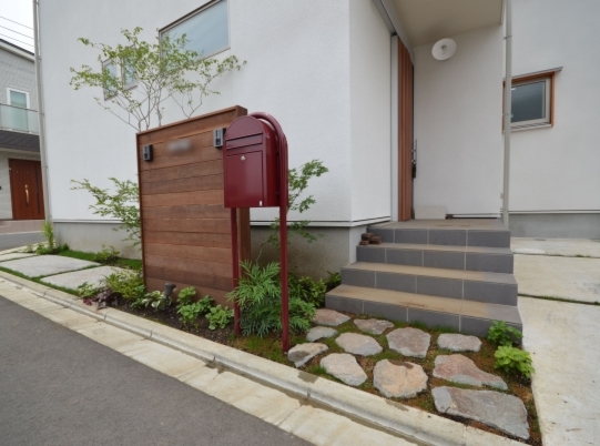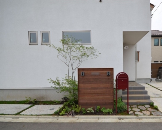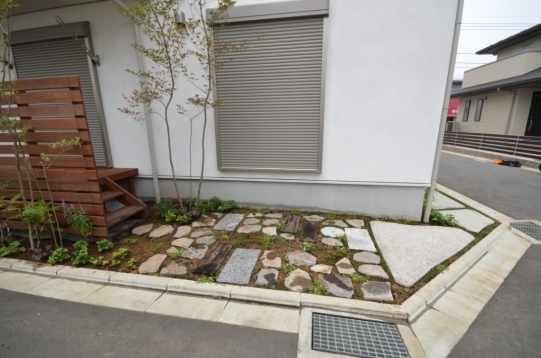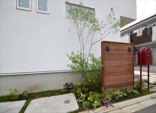 ホーム フォトギャラリー 新築・リフォーム すべて 神奈川県相模原市 新築外構 2世帯住宅 自然素材を使ったシンプルナチュラルデザイン。I様邸 神奈川県相模原市 新築外構 2世帯住宅 自然素材を使ったシンプルナチュラルデザイン。I様邸 新築 新築・リフォーム|すべて シンプルな外観の建物に寄り添うような、自然素材を使った外構・お庭の神奈川県相模原市I様邸の施工紹介です。門柱の脇に植えたツリバナ・コマユミ・ヤマモミジ。白い外壁に樹形や爽やかな緑が映えます。画像のみを表示全 23 枚中 1 枚目を表示Next ≫ 門柱の下に植えた下草類。ギボウシ・ヒューケラ・フッキソウ・バイカウツギ・・・ボリュームが増す事を想定して植えます。画像のみを表示全 23 枚中 2 枚目を表示≪ Prev|Next ≫ ポーチ階段手前に敷いた神奈川県産根府川石。目地は草目地に、西洋芝の種を撒いています。2世帯住宅のI様邸、ウリン材で施工したウッド門柱に、ポストは共用で1つ、ボルドーのボビ、インターホン2個で分けていらっしゃいます。画像のみを表示全 23 枚中 3 枚目を表示≪ Prev|Next ≫ 向かって右側はナチュラルラインなコンクリート洗い出しの駐輪場。左側は自然石素材でお庭兼臨時駐車場。画像のみを表示全 23 枚中 4 枚目を表示≪ Prev|Next ≫ 根府川石・御影石・枕木を敷いたお庭兼臨時駐車場。草目地は西洋芝とヒメイワダレソウを混ぜました。環境に合った方が広がっていく陣地取り合戦のような草目地です。画像のみを表示全 23 枚中 5 枚目を表示≪ Prev|Next ≫ デッキ前に植えた雑木の木々。ジューンベリー・ブルーベリー・アズキナシ・ホザキナナカマド・ソロ・カマツカ・ドウダンツツジ。画像のみを表示全 23 枚中 6 枚目を表示≪ Prev|Next ≫ デッキ上に木陰が出来るような高さのの木を植えました。木は見た目の心地よさだけではなく、微気候調整に一役かってくれます。画像のみを表示全 23 枚中 7 枚目を表示≪ Prev|Next ≫ ウッドフェンス・ウッドデッキは、門柱と同じ素材のウリン材で。ウッドフェンスでプライバシーを守りながら、家の中の床からフラットに繋がるデッキは、中(家)と外(庭)をつなげて、広がり持たせてくれます。画像のみを表示全 23 枚中 8 枚目を表示≪ Prev|Next ≫ ほぼ1年後の様子です。草目地のヒメイワダレソウも広がり、白い花も咲いてますね。画像のみを表示全 23 枚中 9 枚目を表示≪ Prev|Next ≫ 想定通りに門柱前の下草も充実してきてます。画像のみを表示全 23 枚中 10 枚目を表示≪ Prev|Next ≫ 神奈川県相模原市 新築外構 2世帯住宅のハードウッド門柱とポストボビ I様邸 ウリン材でオリジナル施工した2世帯住宅の横板張り門柱。ポストはアクセントカラーにボルドーのボビ。画像のみを表示全 23 枚中 11 枚目を表示≪ Prev|Next ≫ 玄関ポーチ前には、根府川石敷きに、草目地にして。西洋芝の種を蒔きました。画像のみを表示全 23 枚中 12 枚目を表示≪ Prev|Next ≫ 門柱下にはヒューケラ・フッキソウ・ギボウシ・バイカウツギ・・・などを植え、彩りを加えました。画像のみを表示全 23 枚中 13 枚目を表示≪ Prev|Next ≫ 門柱脇には、高木にツリバナ、低木にコマユミ。画像のみを表示全 23 枚中 14 枚目を表示≪ Prev|Next ≫ 門柱裏にも植栽を・・・イロハモミジやキチジョウソウ・シダを植えました。画像のみを表示全 23 枚中 15 枚目を表示≪ Prev|Next ≫ 神奈川県相模原市 新築外構 自然素材でお庭兼臨時駐車場とナチュラル駐輪場 I様邸 ウッドデッキの手前に広がる自然石を敷きのテラス。ご来客時には、臨時駐車場にもなります。玄関側は、ナチュラルな雰囲気の自転車置き場。画像のみを表示全 23 枚中 16 枚目を表示≪ Prev|Next ≫ 手書きのような優しいラインに箱抜きされたコンクリート駐輪場。仕上げを洗い出しにし、自然な風合いをプラスしました。画像のみを表示全 23 枚中 17 枚目を表示≪ Prev|Next ≫ 目地は草目地に。西洋芝の種を蒔きました。画像のみを表示全 23 枚中 18 枚目を表示≪ Prev|Next ≫ 神奈川県産の根府川石や、御影石・枕木を組み合わせました。異素材同士をつなげる草目地の緑。ヒメイワダレソウと西洋芝のミックスで、自然な雰囲気に。雑草が生えても気にならないお庭です。画像のみを表示全 23 枚中 19 枚目を表示≪ Prev|Next ≫ 普段お車を止めていらっしゃる駐車場。画像のみを表示全 23 枚中 20 枚目を表示≪ Prev|Next ≫ 目隠しデッキフェンスに囲まれたハードウッドデッキ 神奈川県相模原市I様邸 おウチの中に広がりを持たせ、外と中をつなげる神奈川県相模原市I様邸のウッドデッキ。横桟のウッドフェンスで囲んで、道路からの視線をカット。表の門柱と同じ素材でウリン材を使って施工。画像のみを表示全 23 枚中 21 枚目を表示≪ Prev|Next ≫ 完全に囲ってしまわない抜け感のあるウッドフェンスは、手前に植えた雑木の木々と合わせて、シンプルな建物の外観にナチュラルな雰囲気をプラス。画像のみを表示全 23 枚中 22 枚目を表示≪ Prev|Next ≫ 敷地ぎりぎりまで植栽