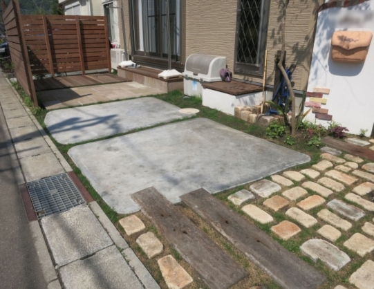 ホーム フォトギャラリー 新築・リフォーム すべて 神奈川県愛甲郡 新築外構 自然素材と敷地を有効に使いナチュラルなお庭兼臨時駐車場 K様邸 神奈川県愛甲郡 新築外構 自然素材と敷地を有効に使いナチュラルなお庭兼臨時駐車場 K様邸 新築 新築・リフォーム|すべて 外構工事は手付かずのままだったK様邸。休日は外でのんびりくつろぎたい・・・しかし、神奈川県愛甲郡K様邸は住宅街の一角。通りを行く人の視線を気にせず過ごしたい、来客時には臨時でお車を止めたい・・・限られた敷地を有効活用し、K様のご希望に答えるべくご提案をさせて頂きました。画像のみを表示全 8 枚中 1 枚目を表示Next ≫ ウッドデッキを造ってしまうと、臨時でお車を止めるスペースがなくなってしまうので、駐車場と同じ高さのテラスに。お車を止める部分は自然石敷きにし、お車が乗っても大丈夫なように。そして、テラスの一部にウッド敷き。掃き出し窓からお庭に出やすいように、板敷き階段を自然石貼りに。草目地の緑と自然素材を使うことで、機能的でありながら、ナチュラルな雰囲気のあるお庭兼臨時駐車場になりました。画像のみを表示全 8 枚中 2 枚目を表示≪ Prev|Next ≫ イタウバ材の横桟ウッドフェンスはH1700で、テラスの目隠しに。デッキチェアを置いて過ごすには気にならない高さです。シェードの紐を引っ掛けるために、両端柱はH2000に。フェンス下の土の部分も活かし、下草や雑木の木々を植えました。画像のみを表示全 8 枚中 3 枚目を表示≪ Prev|Next ≫ 車庫土間は、ナチュラルな曲線で箱抜き。画像のみを表示全 8 枚中 4 枚目を表示≪ Prev|Next ≫ 青空に、お花が可愛らしいザイフリボク・・・。画像のみを表示全 8 枚中 5 枚目を表示≪ Prev|Next ≫ 自然素材と植栽、優しい曲線ライン使いで、K様の思い描くナチュラルさを表現する事が出来ました。画像のみを表示全 8 枚中 6 枚目を表示≪ Prev|Next ≫ 玄関周りは、脇にイロハモミジを、レンガ笠木の天端曲線仕上げの左官仕上げ門柱。ディーズガーデンの、ポストはポーチ、水栓柱はウォータースタンドタイプA 二口タイプ、ホースハンガーを付け、古窯レンガ積みで水受けオリジナルで造りました。画像のみを表示全 8 枚中 7 枚目を表示≪ Prev|Next ≫ 古窯レンガと枕木敷きのアプローチ。草目地には西洋芝。画像のみを表示全 8 枚中 8 枚目を表示≪ Prev 一覧へ戻る 新築・リフォーム 地域別 スタイル別 シーン別 ご来店お客様用資料 すべて 新築 リフォーム 厚木市 相模原市 伊勢原市 海老名市 座間市 綾瀬市 綾瀬市 大和市 愛川町・清川村 藤沢市 藤沢市 茅ヶ崎市 鎌倉市 横浜市 逗子市 葉山町 川崎市 二宮町 大磯町 小田原市 平塚市 秦野市 南足柄市 寒川町 開成町 東京都町田市 東京都八王子市 東京都多摩市 東京都日野市 東京都三鷹市 東京都府中市 東京都世田谷区・杉並区 東京都稲城市 和風 アウトドア 和モダン 駐車場兼庭 ウッドデッキ モリニワ 門周り・玄関周り 目隠し・間仕切り テラス アプローチ 店舗 植栽 施工