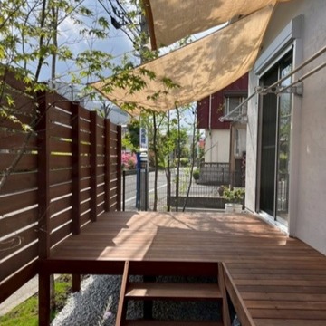神奈川県大和市 平屋の新築外構 ウッドデッキに木陰をつくりで庭を楽しむ T様邸